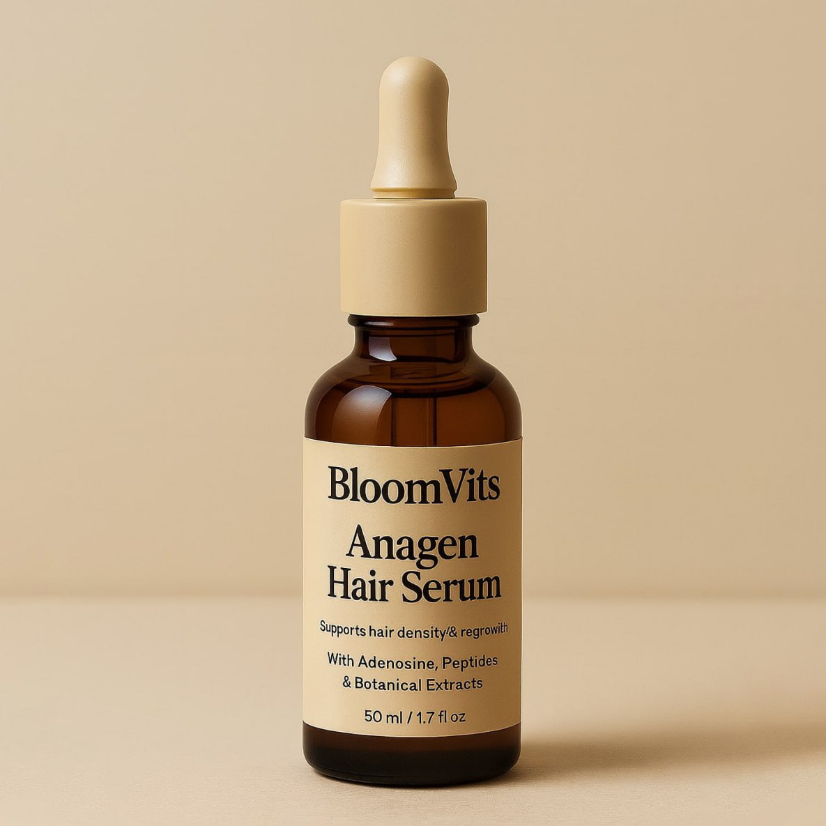 BloomVits Anagen Hair Serum is een krachtig serum dat de haardichtheid en -groei ondersteunt. Het bevat Adenosine, Peptiden en Botanische Extracten die samenwerken om de haargroei te bevorderen en de gezondheid van de hoofdhuid te verbeteren.